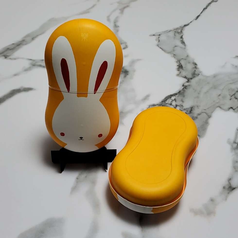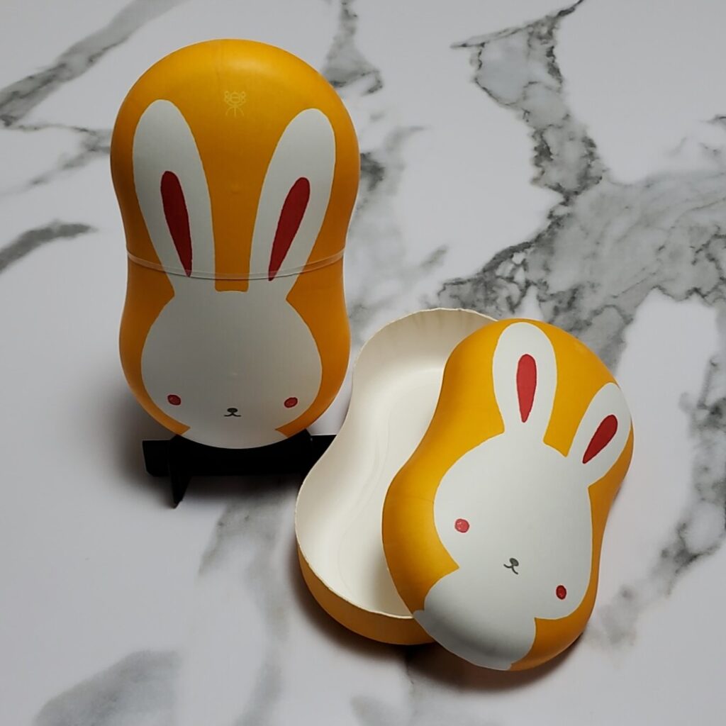 有限会社アート一陽様(出雲縁起うさぎ:楽) 製品名:繭玉容器Ⅲ サイズ:156×86×51mmH 仕様:特色3色印刷+OPニス 使用用途:食品二次容器(菓子) 紙うつわ®の代表的な「繭玉容器Ⅲ」に蓋にうさぎ柄を施し、蓋の背景と本体を橙色に印刷し、「出雲縁起うさぎ:楽」として「バターサブレ」をいれて販売。 パッケージを飾る「楽」の文字には、楽しいことがたくさんありますようにという願いが込められています。繁栄(代々家が続く)の色とされる橙は、財運や健康長寿・子孫繁栄に相乗効果があるといわれています。 お問い合わせはこちら