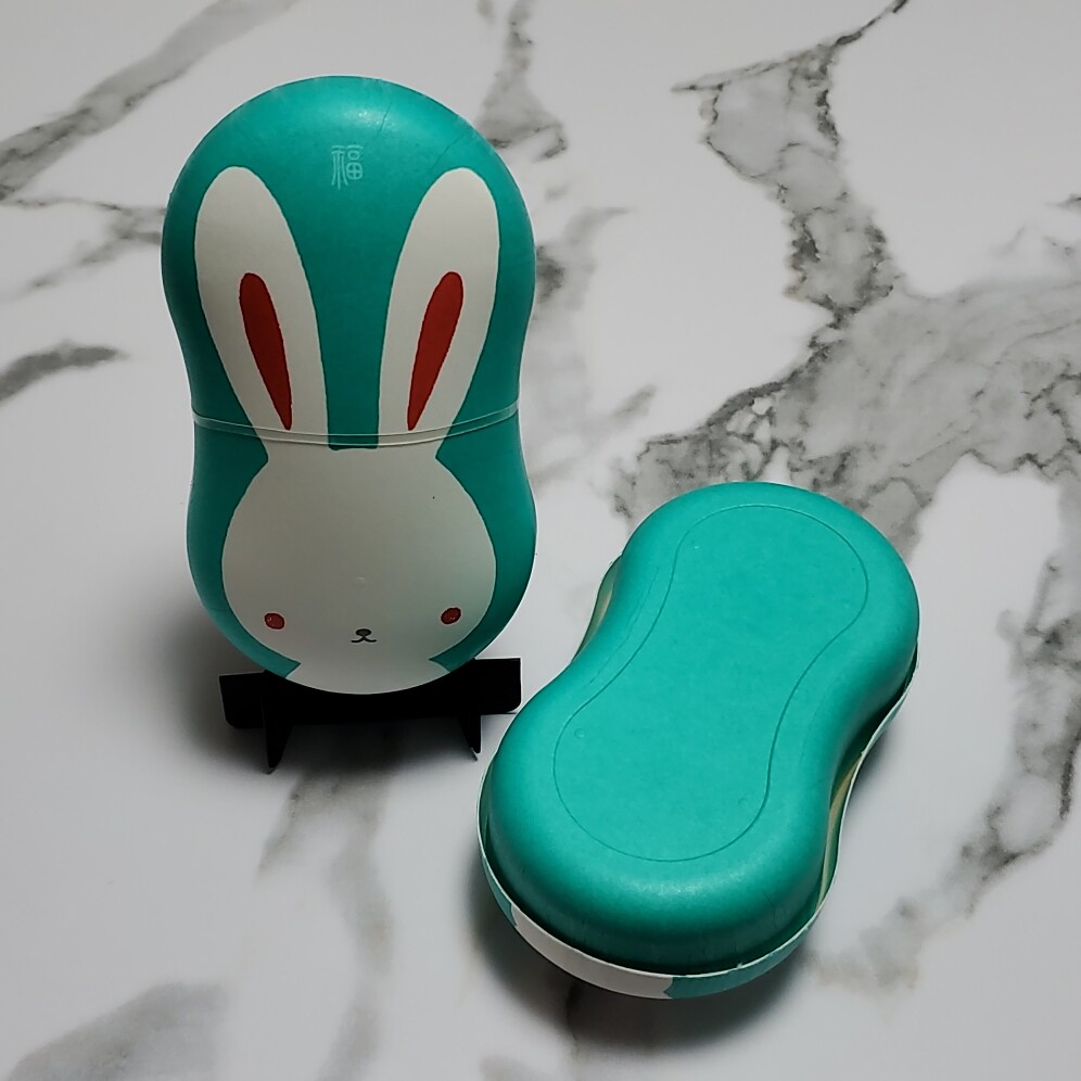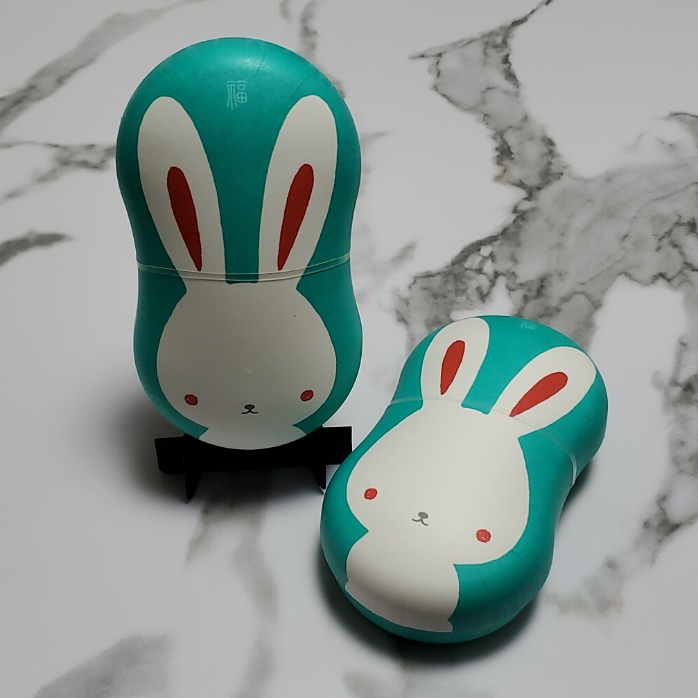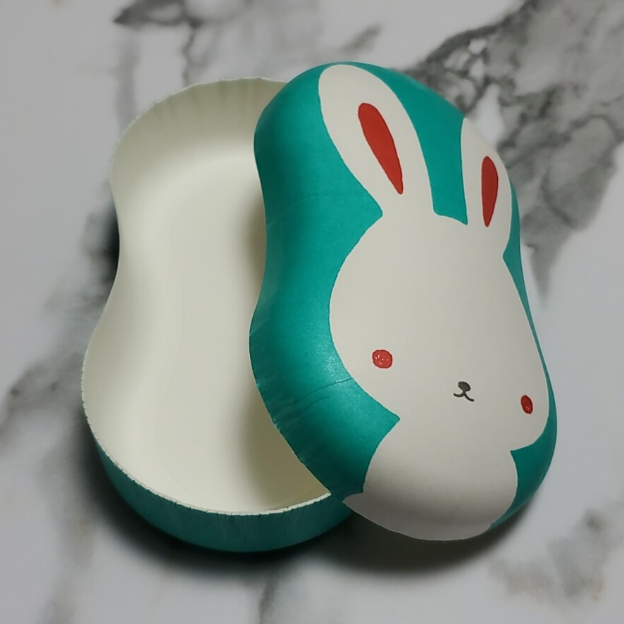 有限会社アート一陽様(出雲縁起うさぎ:福) 製品名:繭玉容器Ⅲ サイズ:156×86×51mmH 仕様:特色3色印刷+OPニス 使用用途:食品二次容器(菓子) 紙うつわ®の代表的な「繭玉容器Ⅲ」に蓋にうさぎ柄を施し、蓋の背景と本体を青緑色に印刷し、「出雲縁起うさぎ:福」として「シャインマスカットサブレ」を入れて販売。 パッケージを飾る「福」の文字には、幸福が訪れますようにという願いが込められています。活動や再生、復活の色とされる青緑は、社交運や仕事運に相乗効果があるといわれています。 お問い合わせはこちら