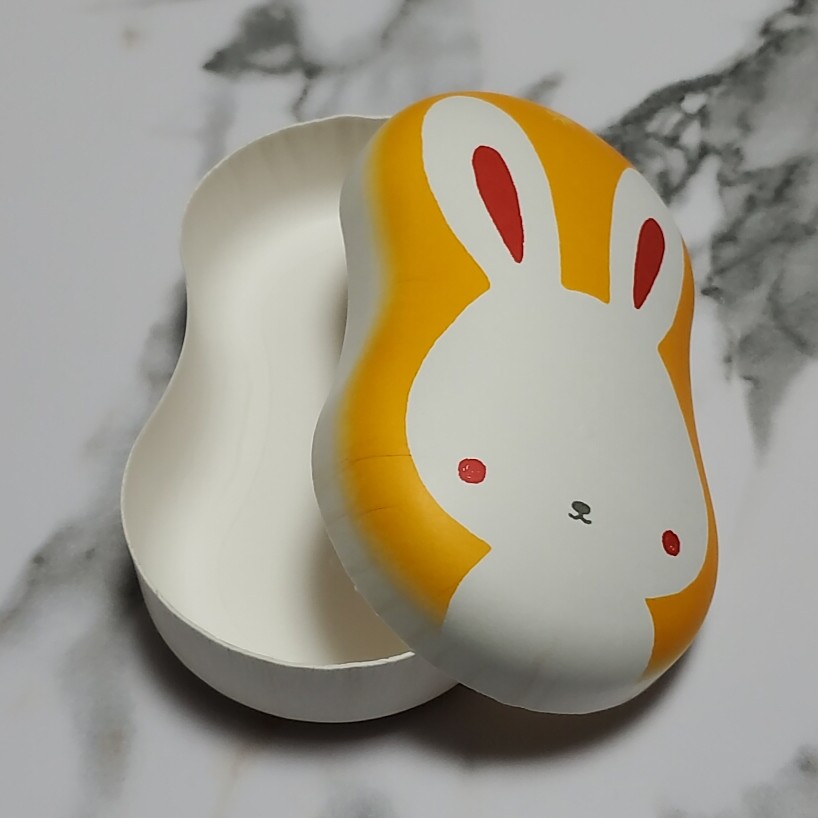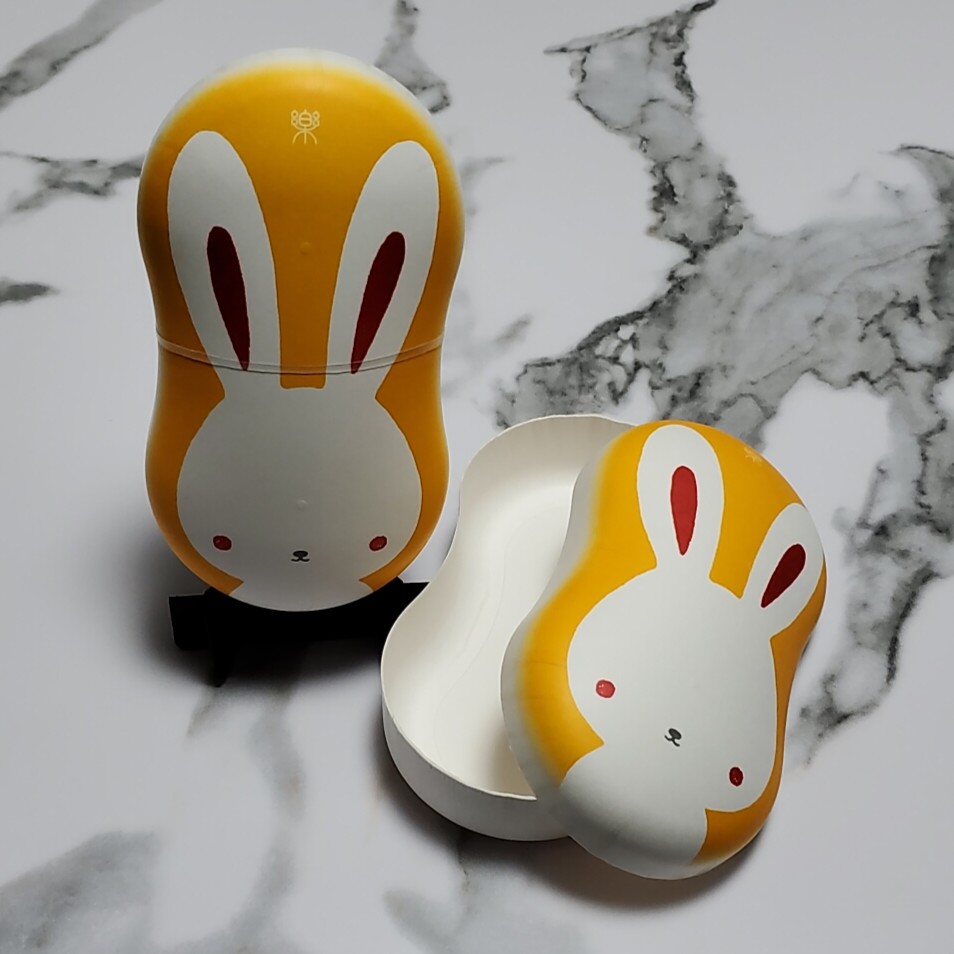 有限会社アート一陽様(出雲縁起うさぎ:楽(Ver:2026年)) 製品名:繭玉容器Ⅲ サイズ:156×86×51mmH 仕様:特色3色印刷+OPニス 使用用途:食品二次容器(菓子) 紙うつわ®の代表的な「繭玉容器Ⅲ」に蓋にうさぎ柄を施し、蓋の背景を橙色に印刷し、本体を無地にして2026年バージョン「出雲縁起うさぎ:楽」として「バターサブレ」を入れて販売。 パッケージを飾る「楽」の文字には、楽しいことがたくさんありますようにという願いが込められています。繁栄(代々家が続く)の色とされる橙は、財運や健康長寿・子孫繁栄に相乗効果があるといわれています。 お問い合わせはこちら