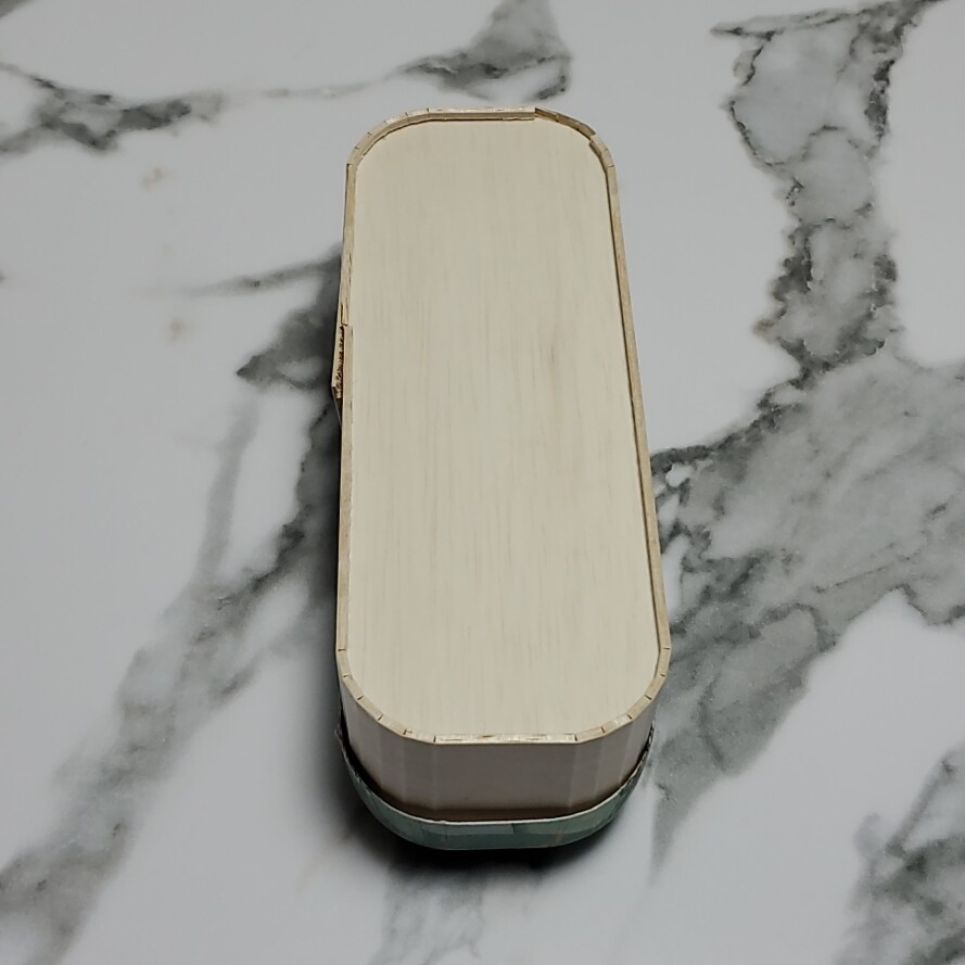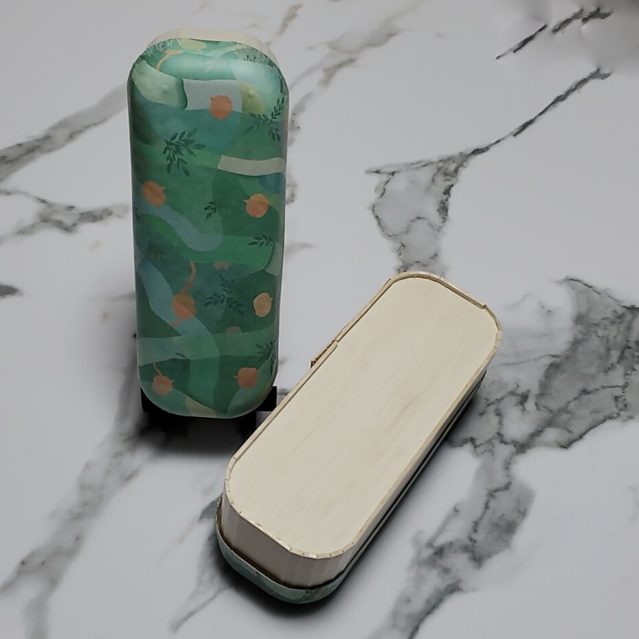 こんにゃく工房 迦しょう様(てんぐの玉手箱(小)) 製品名:ペーパーウッドボックス長方形(小)てんぐの玉手箱 サイズ:206×76×66mmH 仕様:蓋・・・4色印刷+OPニス、身・・・ファルカタ材(わっぱ) 使用用途:食品二次容器(こんにゃくフルーツゼリー) 紙うつわ®の「長方形容器(小)蓋」にイメージデザインを施し、本体をファルカタ材を使用したわっぱにすることで高級感を演出。 お問い合わせはこちら
