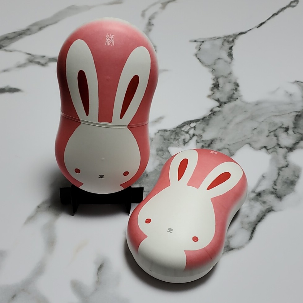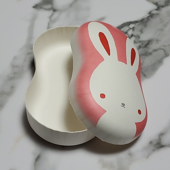 有限会社アート一陽様(出雲縁起うさぎ:縁(Ver:2026年)) 製品名:繭玉容器Ⅲ サイズ:156×86×51mmH 仕様:特色3色印刷+OPニス 使用用途:食品二次容器(菓子) 紙うつわ®の代表的な「繭玉容器Ⅲ」に蓋にうさぎ柄を施し、蓋の背景をピンク色に印刷し、本体を無地で2026年バージョン「出雲縁起うさぎ:縁」として「いちごサブレ」を入れて販売。 パッケージを飾る「縁」の文字には、良いご縁がありますようにという願いが込められています。魔除けや厄除け、生命力を象徴する色とされるピンクは、恋愛運や縁結びに相乗効果があるといわれています。 お問い合わせはこちら